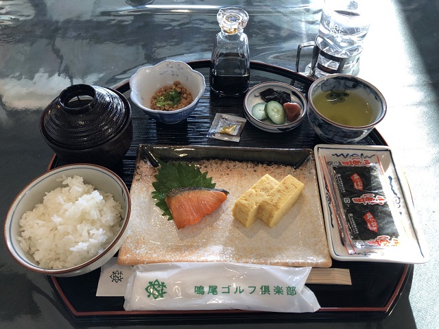 なんとも贅沢なことに翌日も鳴尾に向かいます。連日の好天に感謝。今日は朝食をいただきながらスタートを待ちます。さあいくぞのはずが、ティーショットはチョロって池へ。え~?ショートは乗ってくれましてパー、次もバンカー入れましたがボギーですみました。しかしショートでの大たたきをやっちまった後は続くホールでもボールにきちんと当たりません。中盤3ホールは7並びになってしまいました。それでも何が変わったのかわかりませんがボボパと復調してお昼です。