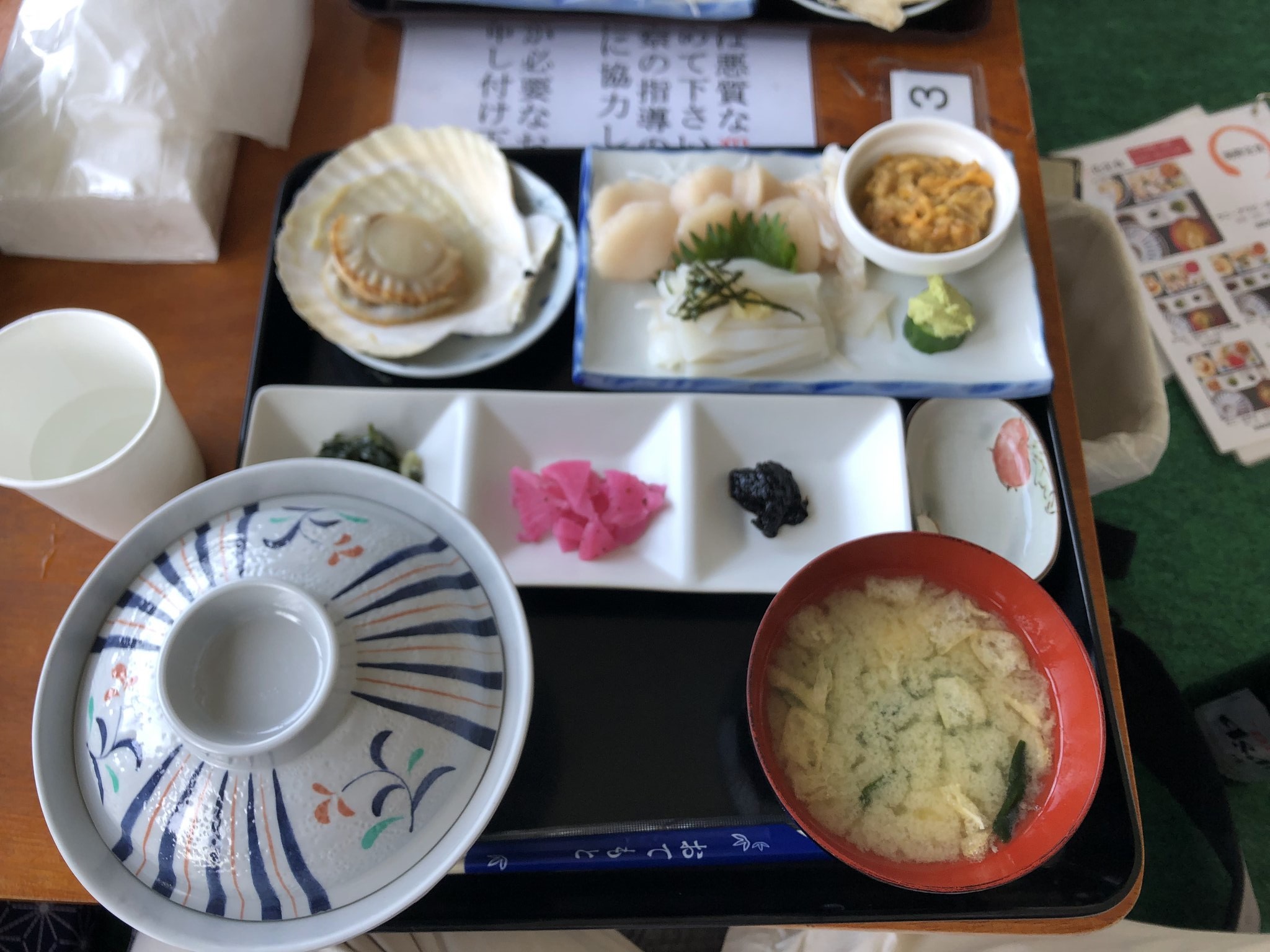 今年も行ってきました青森!青森というとやっぱり、「♪ふ~ゆ~げ~しき~♪」が頭に浮かびますよね。冬ではなく初夏だし、夜行列車ではなく飛行機だし、連絡船に乗るわけでも海峡を渡るわけでもなくレンタカーなんですけどね(青函連絡船っていまはないのでは?)。昼食は海沿いの食堂でホタテ定食をいただきます。去年は確かホタテが品切れでしたのでリベンジ達成です(ゴルフのリベンジはどこもできないままなのにナ)。我々が席に着いてから続々とお客さんがやってきました。人気ですね。