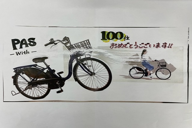 さあ、お待たせいたしました! お待ちかねの本日の目玉賞品ヤマハ電動自転車PASは100位の方に贈られます。それでは発表いたします。第100位はT.N様、おめでとうございます。こちらが目録となります。賞品は近日中にT.Nさん宛で発送いたします。おめでとうございました。