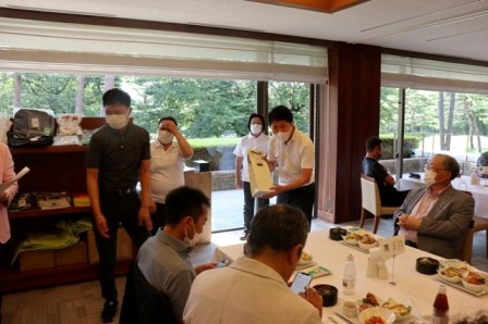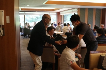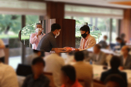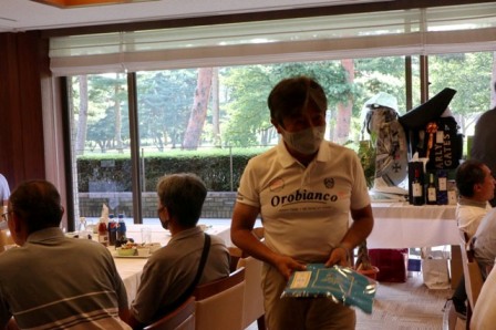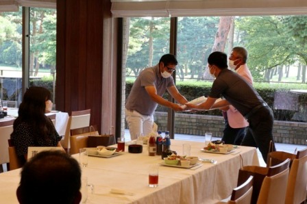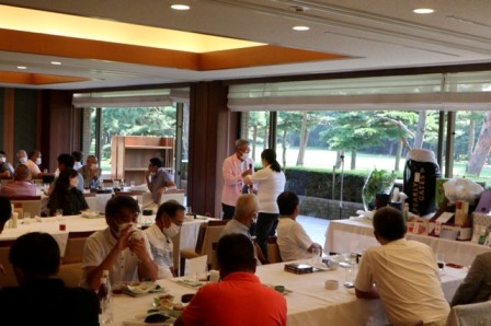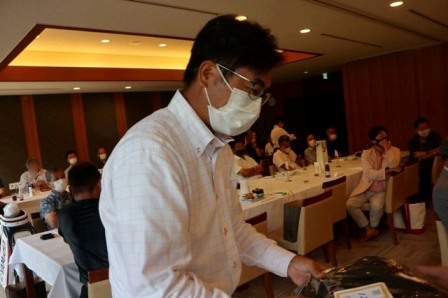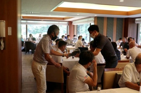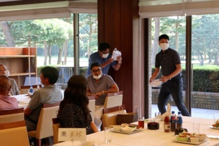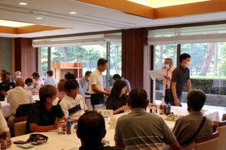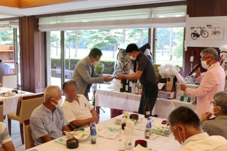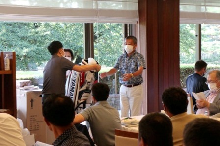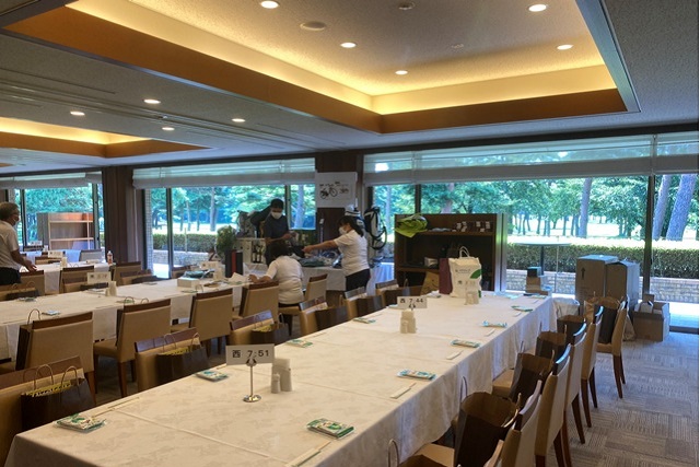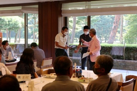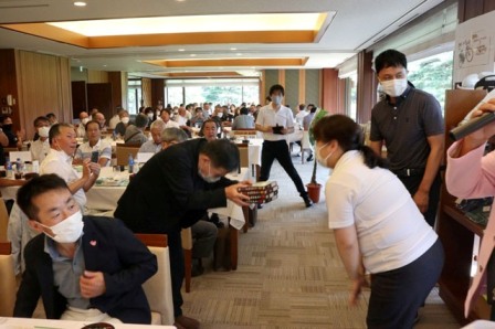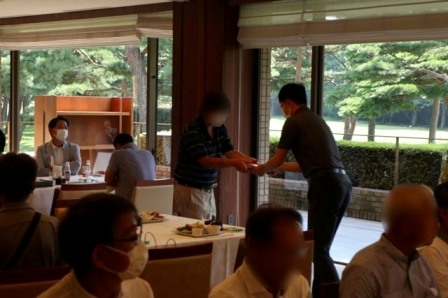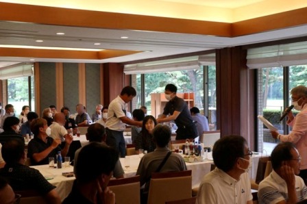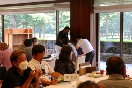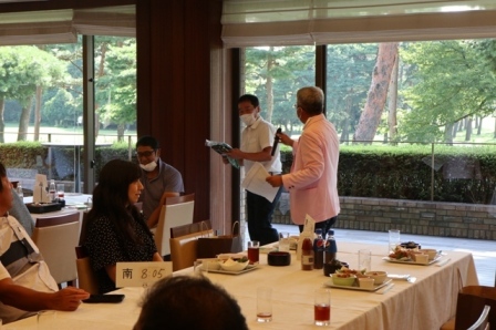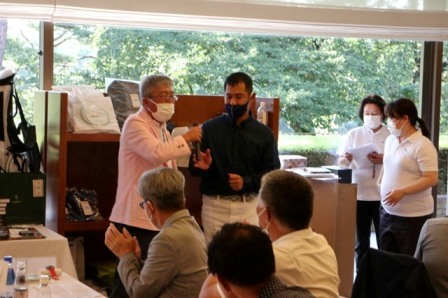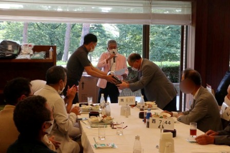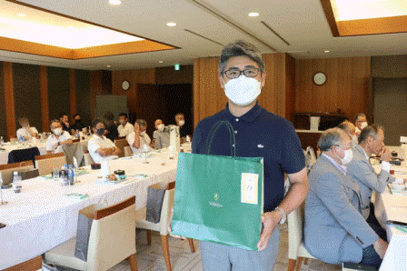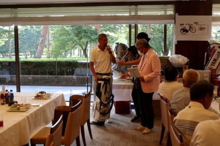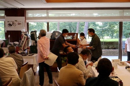 14時45分、お待たせいたしました、表彰式開始です。マエシンのマイクパフォーマンスが始まりました。第〇〇〇位は東〇〇南〇〇グロス〇〇〇ハンディキャップ〇〇ネット〇〇で〇〇さんです。撮影隊と贈呈隊が動きます。贈呈はTさん、弊社ライターテツの一歩進んで一歩下がるでお馴染みのテツ様にもご協力いただきました。