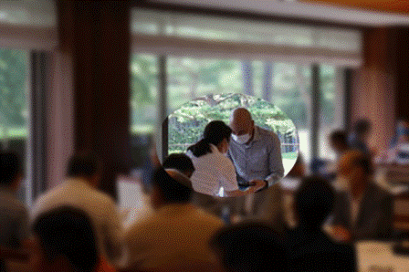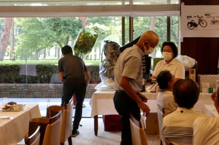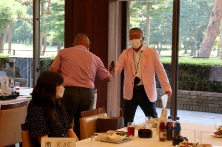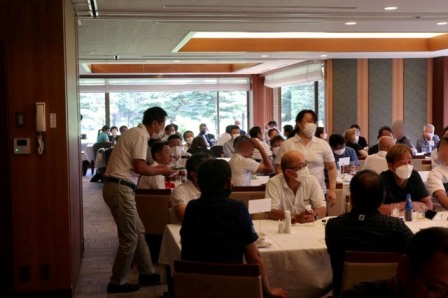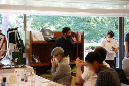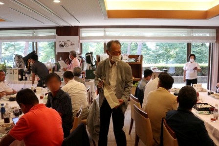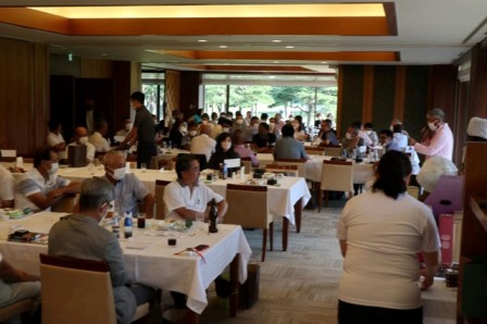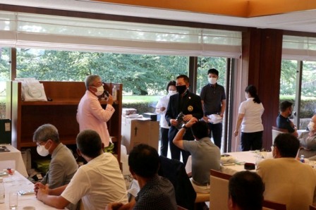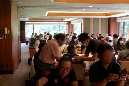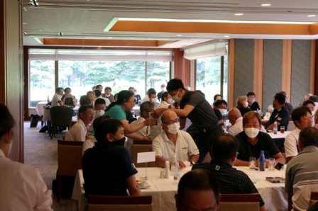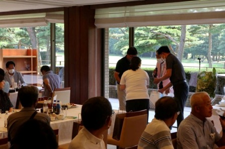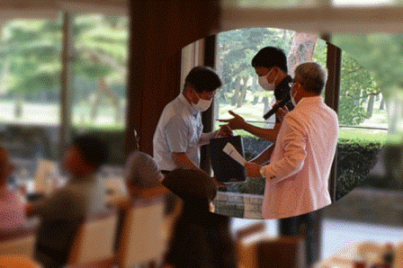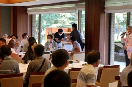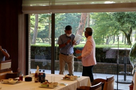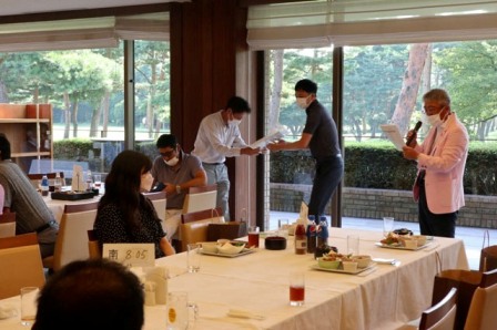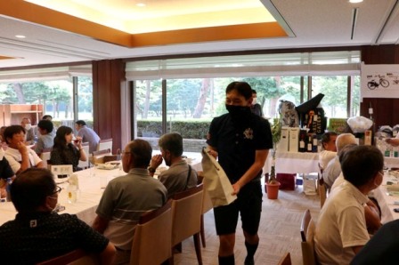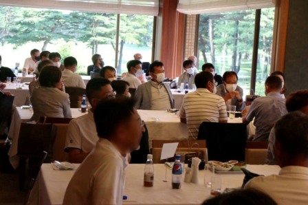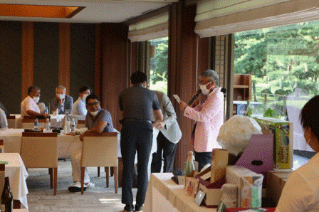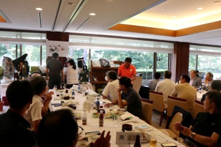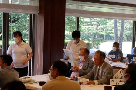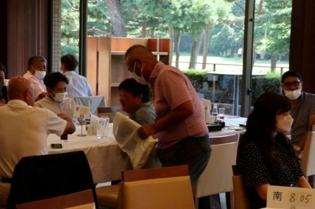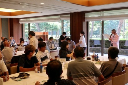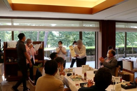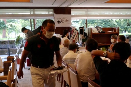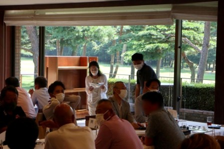 14時45分、お待たせいたしました、表彰式開始です。マエシンのマイクパフォーマンスが始まりました。第〇〇〇位は東〇〇南〇〇グロス〇〇〇ハンディキャップ〇〇ネット〇〇で〇〇さんです。撮影隊と贈呈隊が動きます。贈呈はTさん、弊社ライターテツの一歩進んで一歩下がるでお馴染みのテツ様にもご協力いただきました。