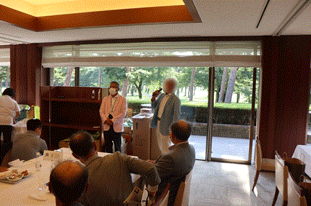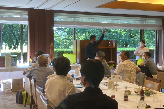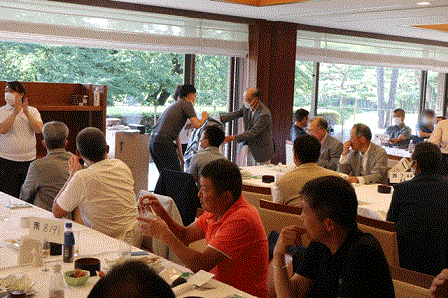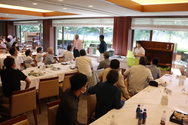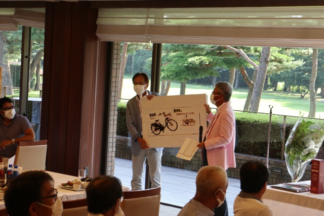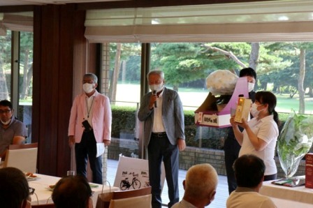 優勝者のK.K様には優勝目録、胡蝶蘭、その他賞品が手渡されます。 K.K様はマエシンと30年来お付き合い頂いております。いつも大変お世話になっております。それでは優勝スピーチをお願い致します。