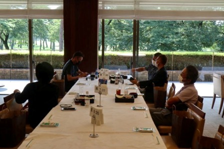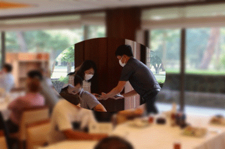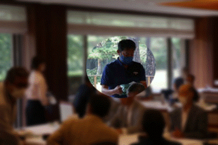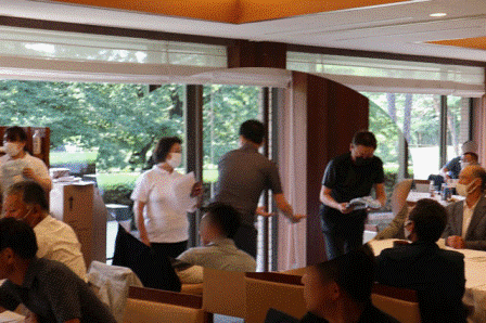 暑い中をお疲れ様でした。パーティー会場の準備中ですのでしばらくの間レストランにてお寛ぎくださいませ。飲み物は何になさいましょうか・・・