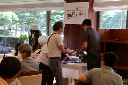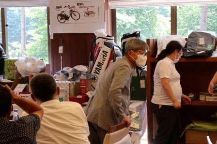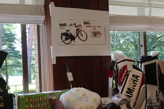 賞品の陳列では縁のTさんが大活躍。順位プレートを貼り次々に賞品が並べられていきます。キャディバックはこの辺に置きますか・・優勝賞品にはこれも付けちゃえ、本日の100位目玉商品ヤマハ電動自転車のプレートはこの辺りに飾ろうか・・・プレートはこれで水平ですか?もう少し右側を上げて、もうチョイ下で、ストップ・・・着々と賞品の陳列が進みます。