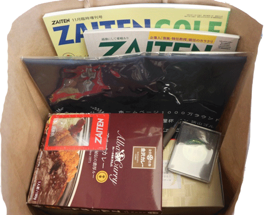 T.S様からはパターマット、ZAITEN130冊、バーディトーリ ポロシャツ(白・みず色・緑)、バーディトーリ帽子(白・黒・青)、タンブラー、商品券15,000円分と沢山の賞品を頂きました。いつもありがとうございます。