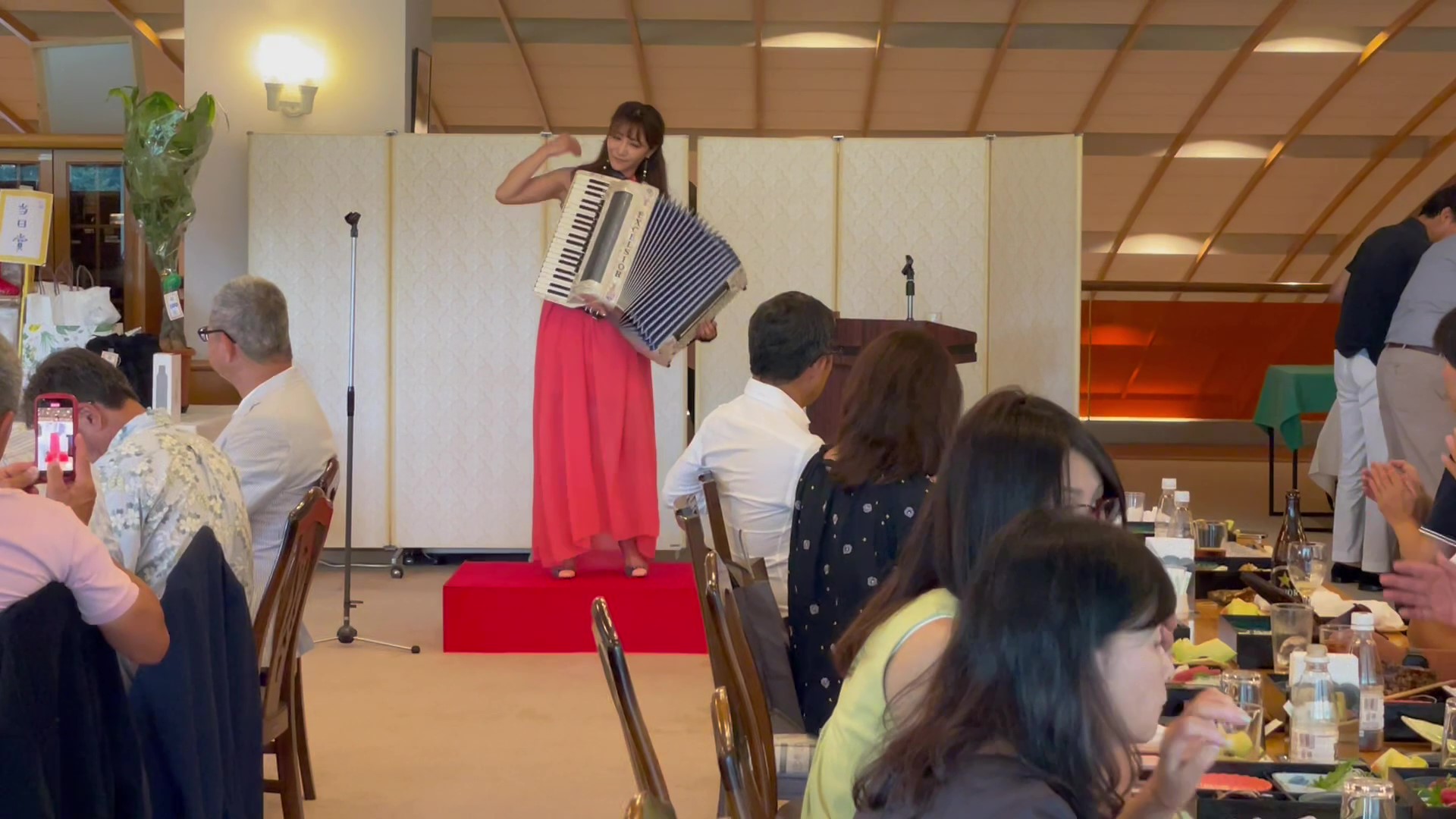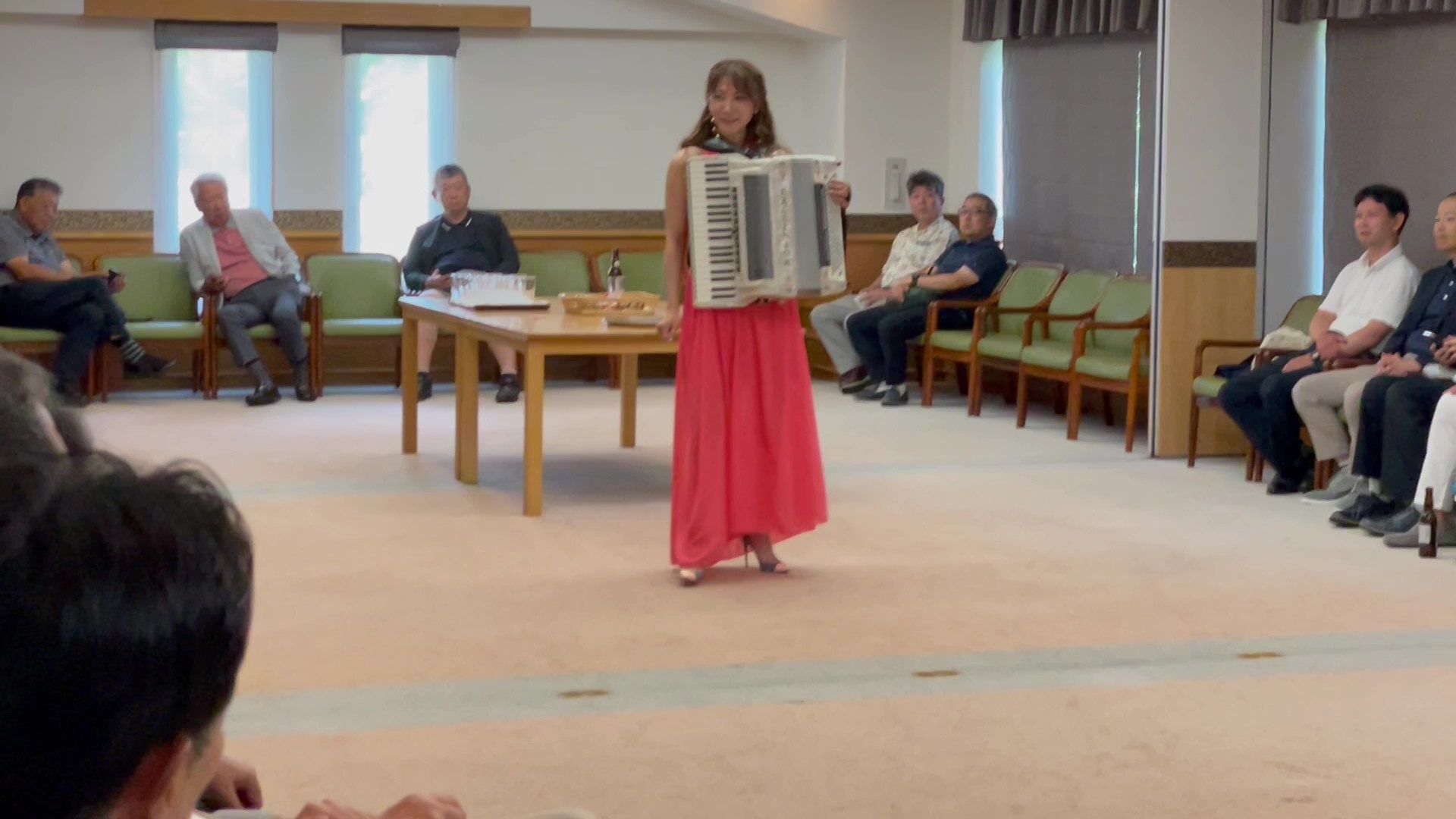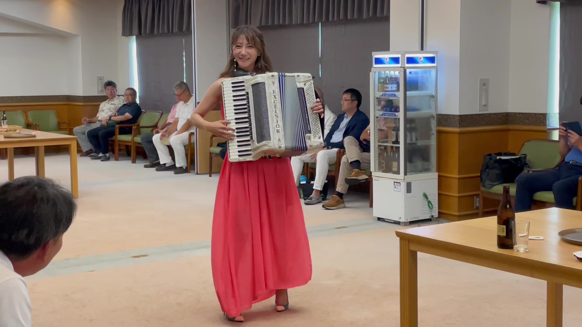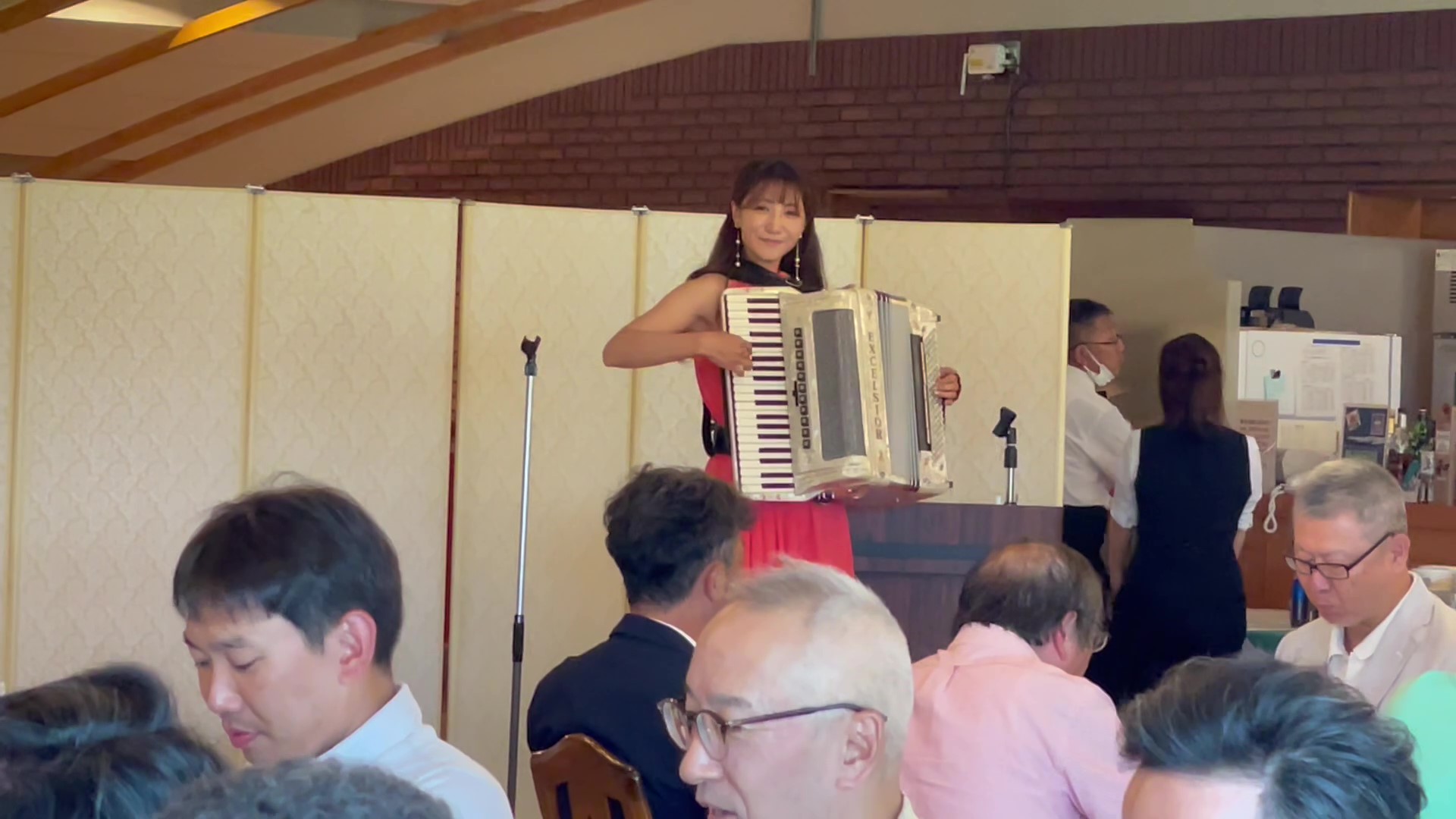 皆さん手拍子で盛り上げます。アップテンポな演奏が続きます。あれ? この演奏は・・ラジオ体操??? マエシンが体操します。楽しそうなコラボになりました。質問コーナーでは、吉岡Reeりささんが装着されているアコーディオンの価格についての質問がありましたが・・・・その価格にビックリしました。