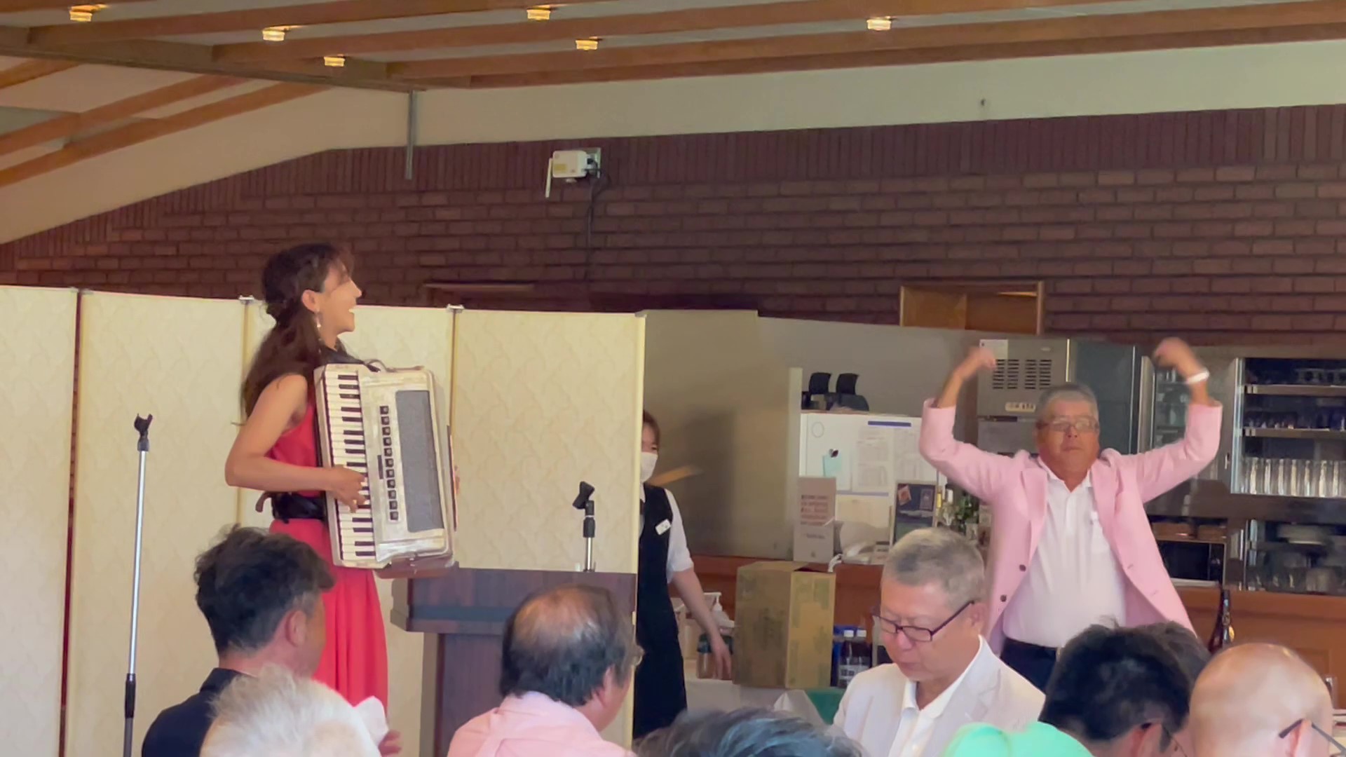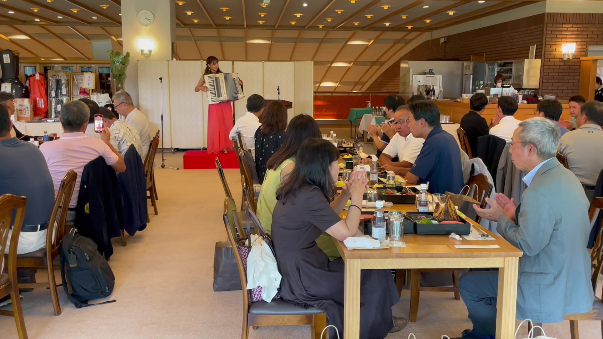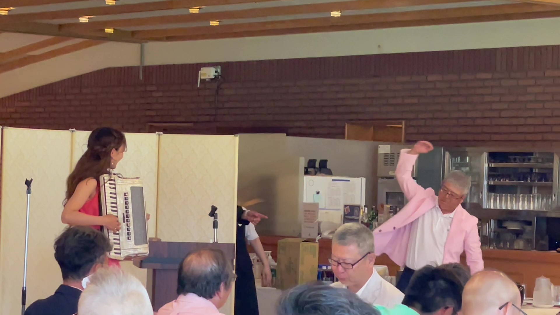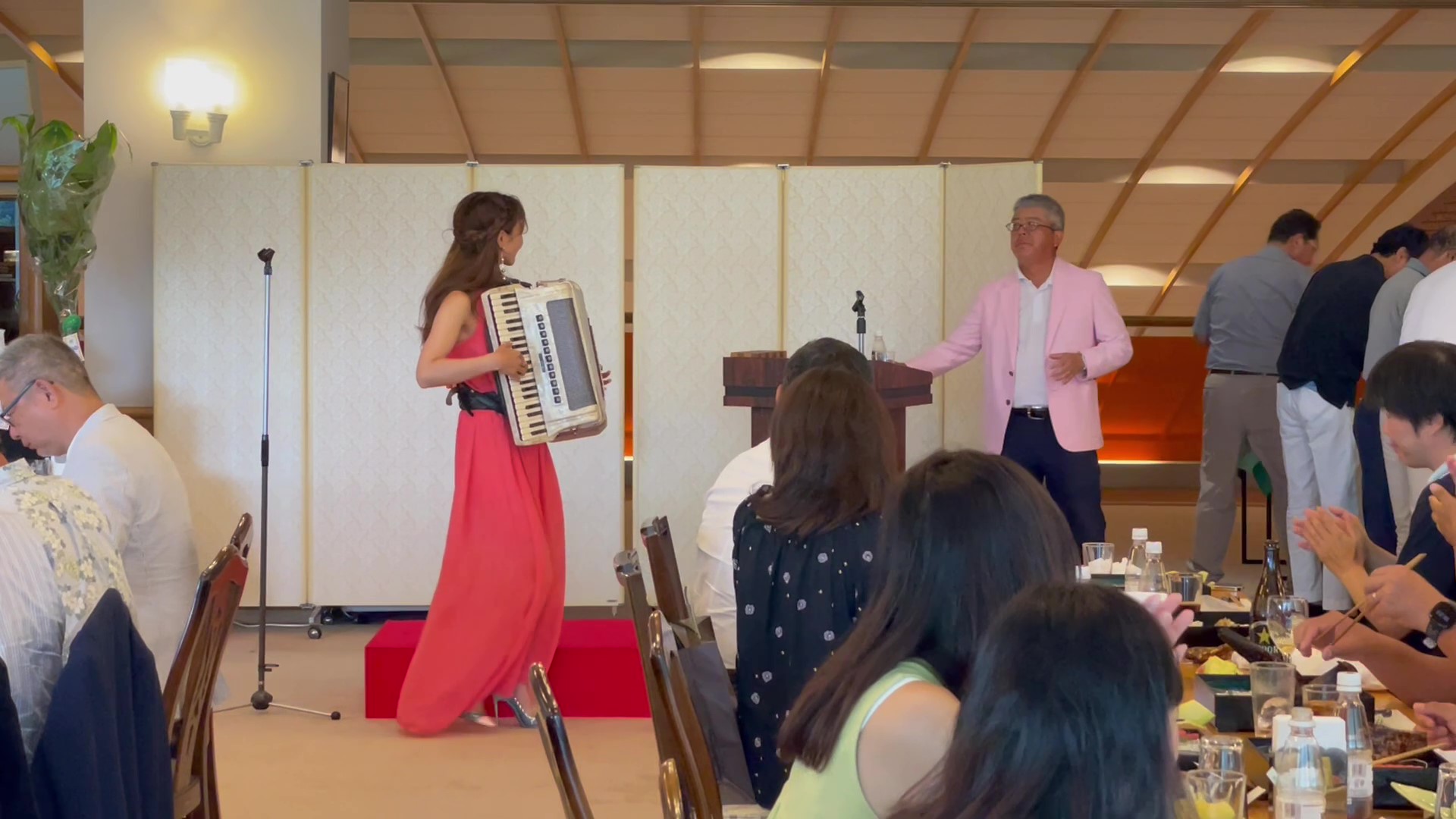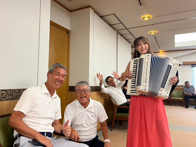 皆さん手拍子で盛り上げます。アップテンポな演奏が続きます。あれ? この演奏は・・ラジオ体操??? マエシンが体操します。楽しそうなコラボになりました。質問コーナーでは、吉岡Reeりささんが装着されているアコーディオンの価格についての質問がありましたが・・・・その価格にビックリしました。