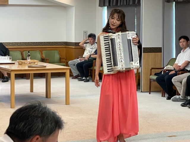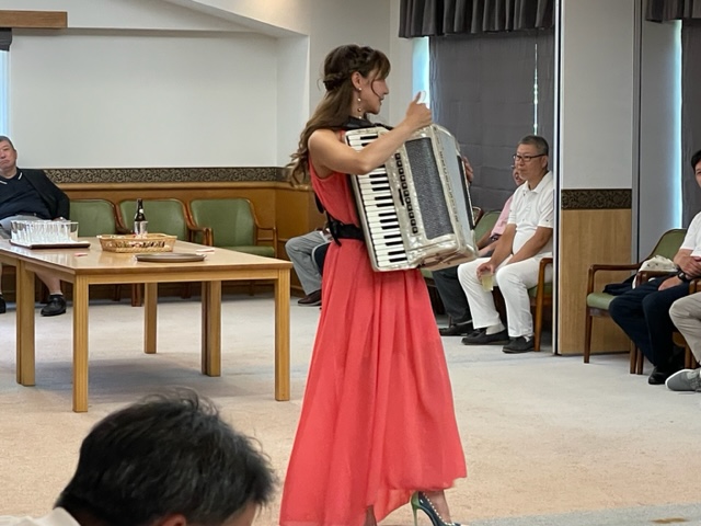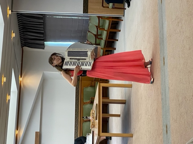 13時50分、テレ朝の「題名のない音楽会」に複数回登場されていて、2021年イタリアでの世界大会第2位のアコーディオン奏者吉岡Reeりささんがお越し下さる。で、控室にお通しする。