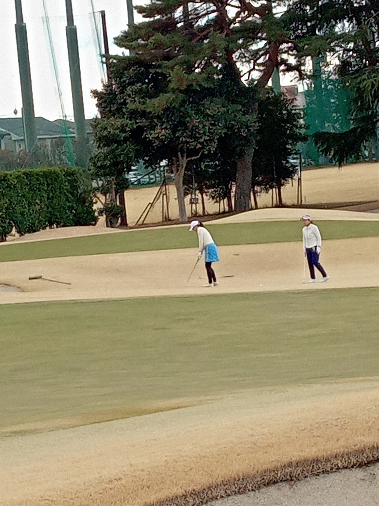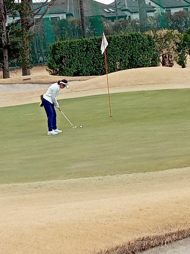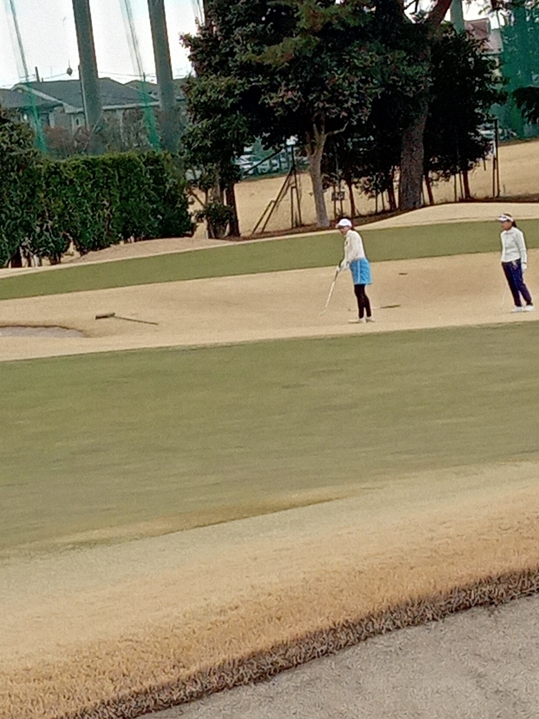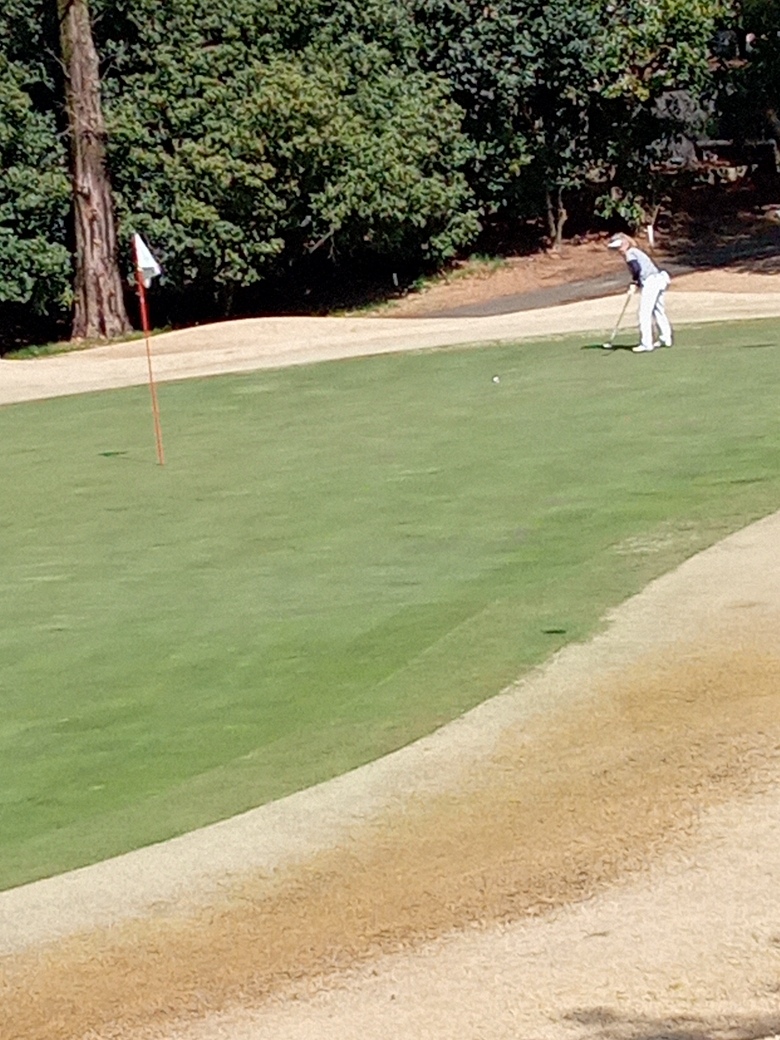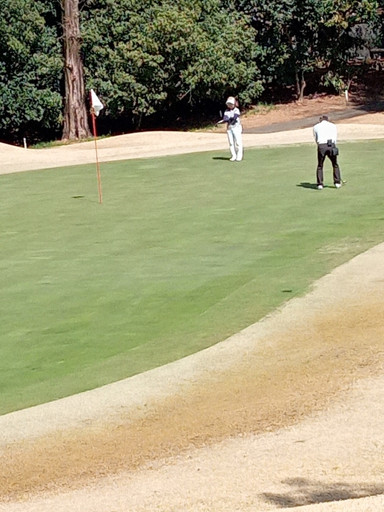 最終組がスタート前にトップ組が18番グリーン前に、村口史子プロのアプローチです・・タケ小山プロがこちらに気付き手を振ってくれてます。