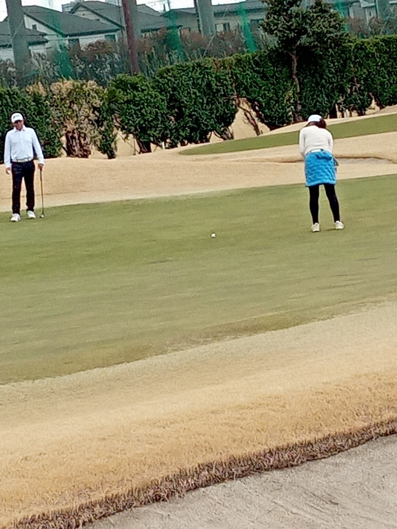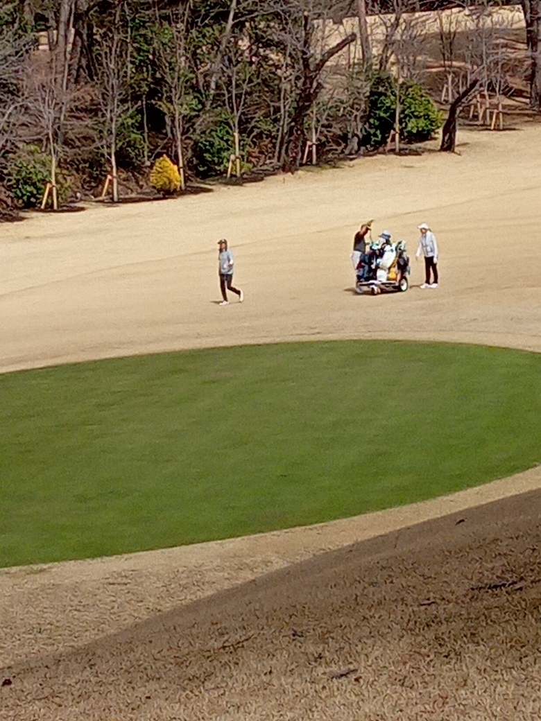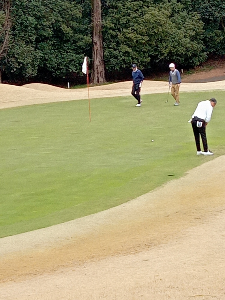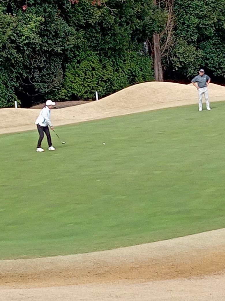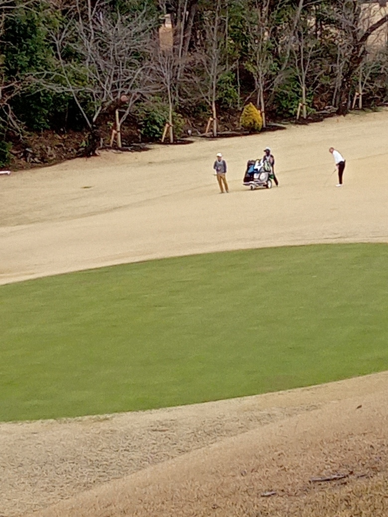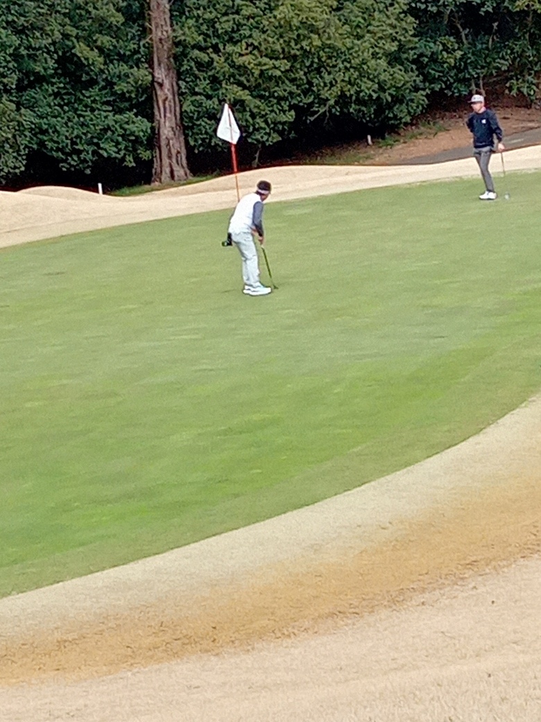 最終組がスタート前にトップ組が18番グリーン前に、村口史子プロのアプローチです・・タケ小山プロがこちらに気付き手を振ってくれてます。