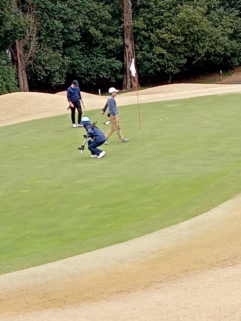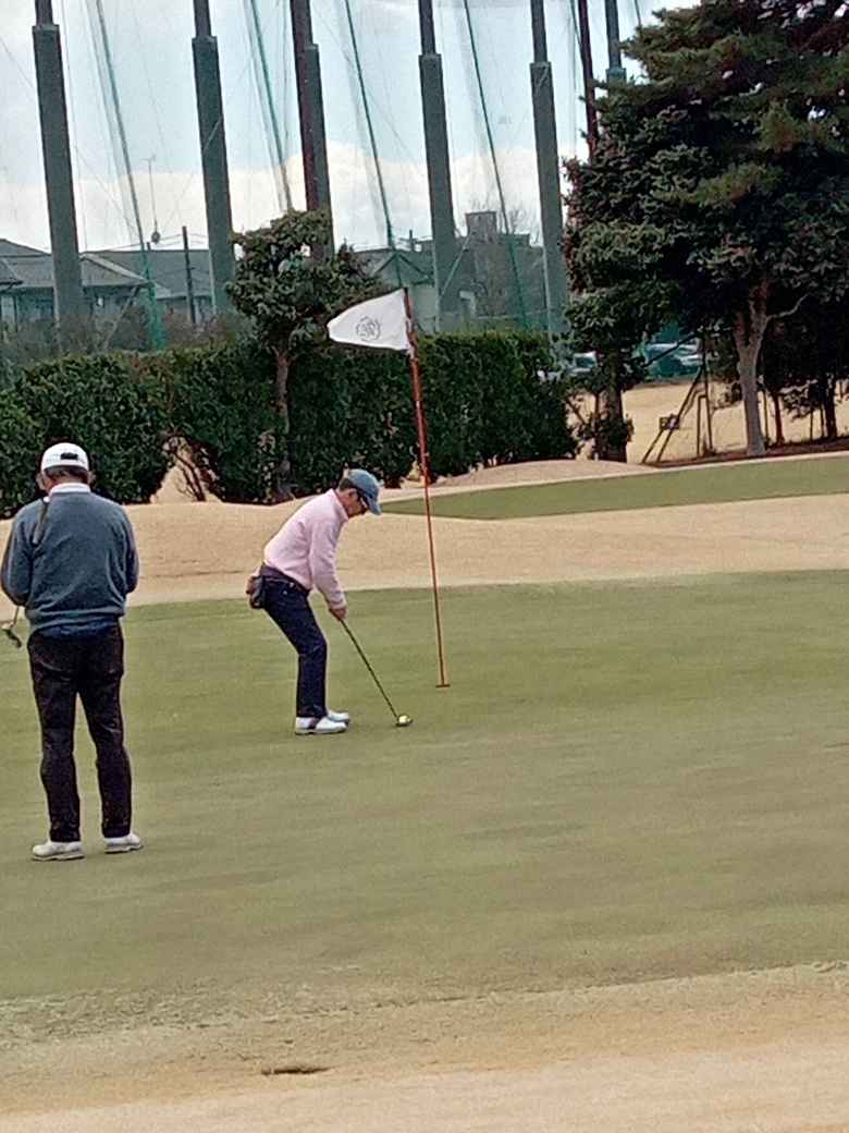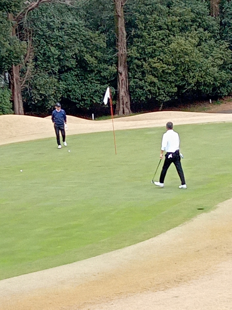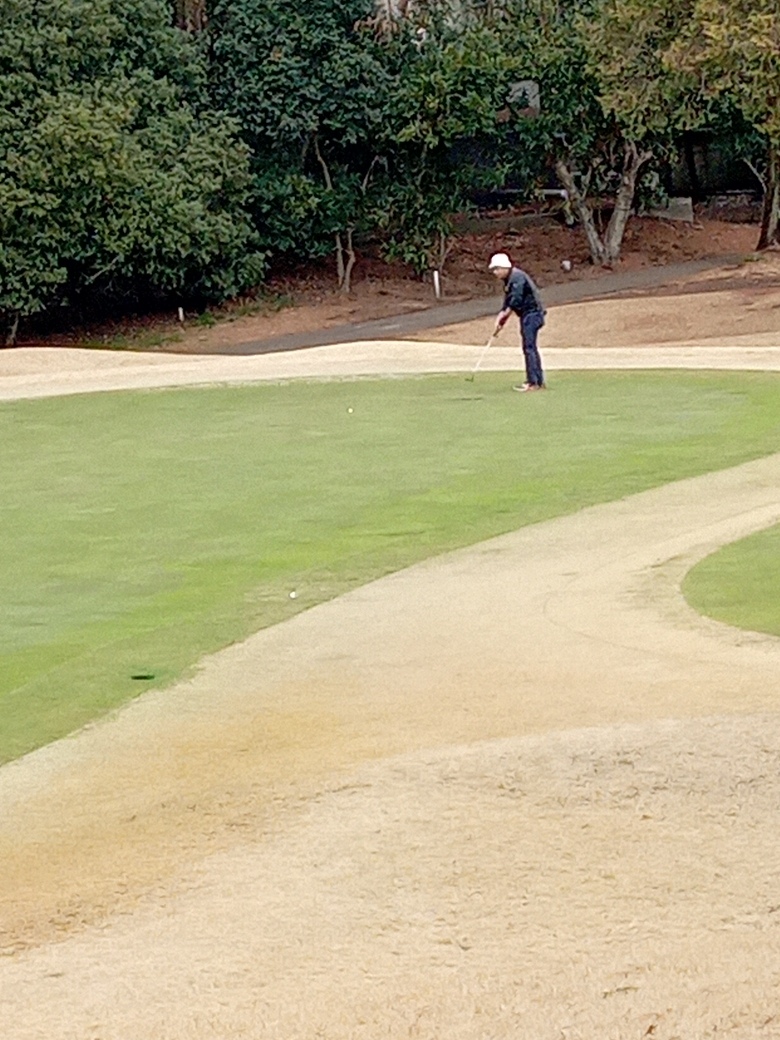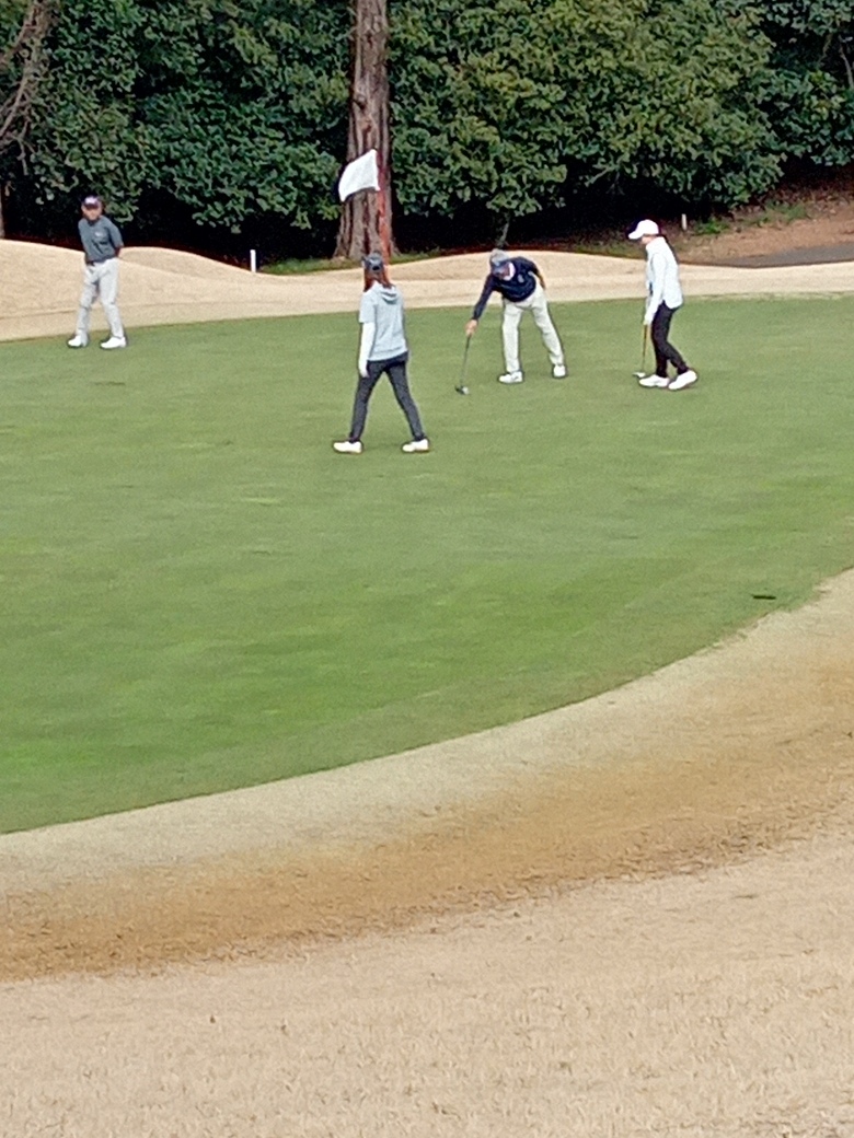 最終組がスタート前にトップ組が18番グリーン前に、村口史子プロのアプローチです・・タケ小山プロがこちらに気付き手を振ってくれてます。