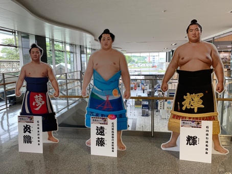 炎鵬(金沢市出身)、遠藤(穴水町出身)、輝(七尾市出身) の三力士がお見送りしてくれます。