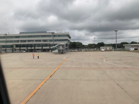 地上支援員の他、後方の空港ビルの窓越しからセキュリティスタッフも手を振っています。