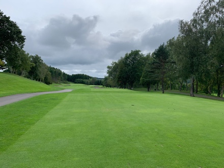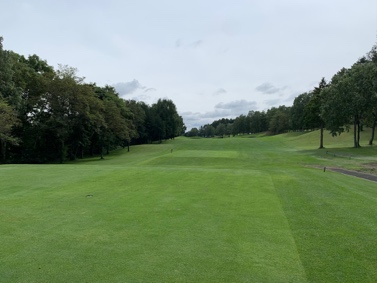 コースを折り返してやや打ち下ろしのホール、ティーショットの着地地点は右側山裾がフラット、ややフェアウェイ左に傾斜して、左の木は段下になり木の左は浅く危険です。