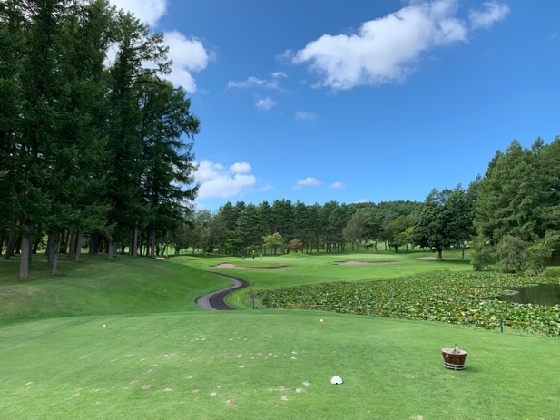 池越えのティーショットで景色は抜群、Aグリーンは長めで真っ直ぐ正面にあります。