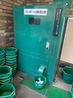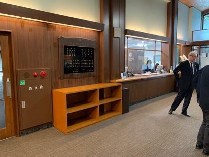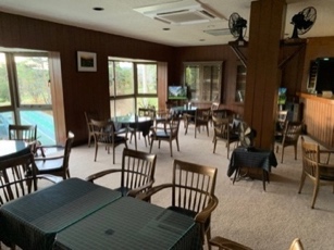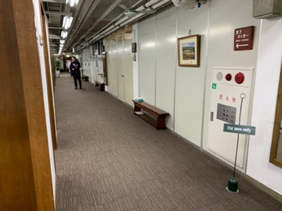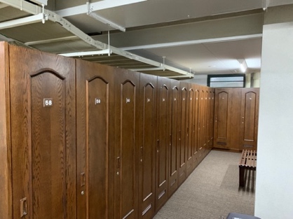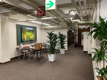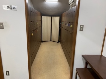 正面のフロント階から入ると平屋建て風、ですがロッカーなどが階下に設けられていて、すぐに女子ロッカー室、左90度曲がると手前に小物入れやとなりにロッカーが並び左手にアテストテーブル・血圧計、右手にキャディバッグ保管室、その右はトイレとコースやスタート室につながる出入口、奥には浴室があります。