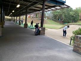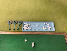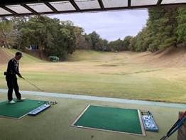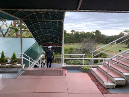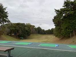 1階は屋根付き、屋上2階(ドライバー使用不可)、1階右側にはアゴの高いバンカーがあり、スタート前に数発でも実践練習ができるのは、嬉しいです。