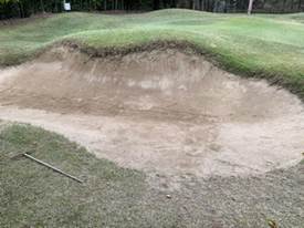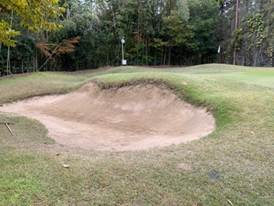 ・小さなバンカー、周囲のバンカーに流れ込む傾斜にホールは反応、簡単にバン入します。