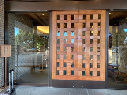 正面玄関の木目格子製の自動ドアが開き、ハウスの中へと導いています。