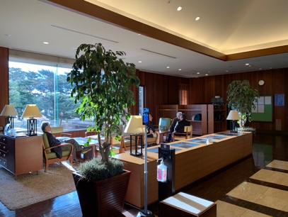 玄関に入ると、まずは右手にフロントカウンター、左手に明るく採光が差し込む応接スペースがあり受付開始を待つ来場者が談笑、機能的でコンパクトにまとまっています。