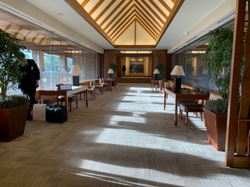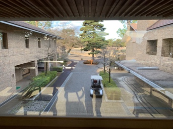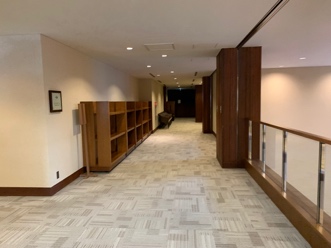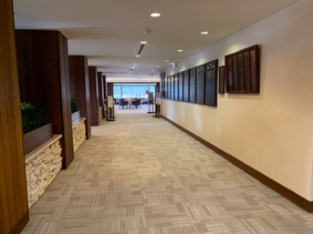 両サイドガラス張りの渡り廊下を行くと、奥のレストラン・ロッカールーム等のある棟への動線と続きます。