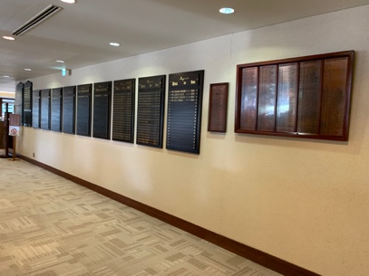 渡り廊下の突き当たりの絵画の右側を曲がったレストラン棟の入口には、メンバーならいつかは刻みたいチャンピオンボードがお迎えをしてくれます。