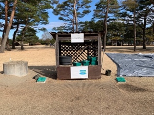 練習球・目土砂・目土袋などがボックスに用意があり、アプローチグリーン面は刈り込み整備されていますが、アプローチする打席面は残念なことに芝付きが整っていないようで砂地が優位になっていました。