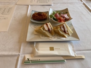 コンペルームに集まり、ワンドリンクと狭山の自慢の軽食を味わいます。