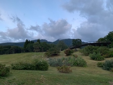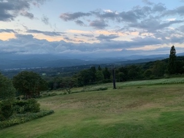 朝食ビュッフェ前、朝日に誘われ風にたなびくすすきの穂に秋を感じお庭を散策し、妙高山と眼下の景色に癒され、新鮮な空気を深呼吸すると身も心も洗われる気分に浸りました。