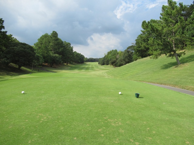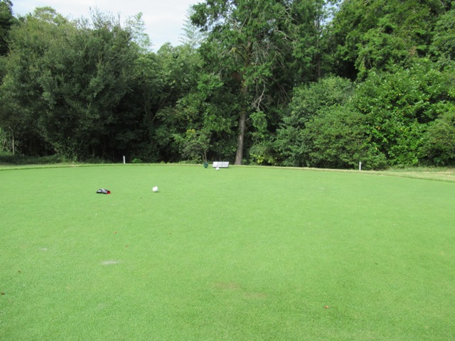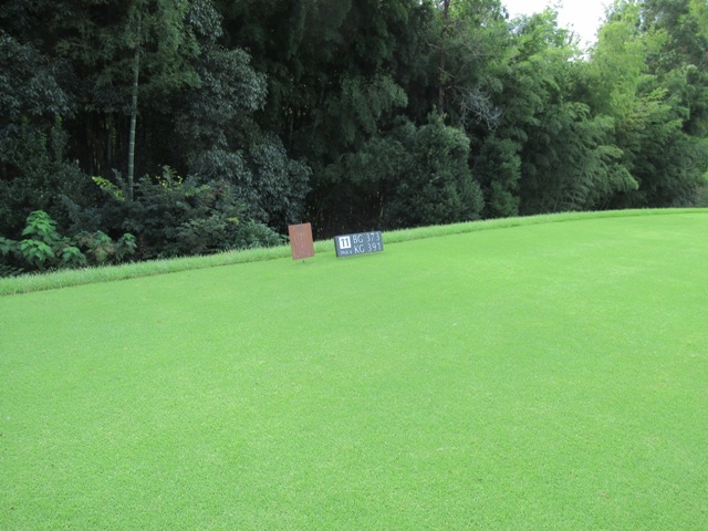 11番右ドッグの411yミドルは、ドライバーはまずまず。6アイアンでそっと打つもショボ球。寄らず入らず。