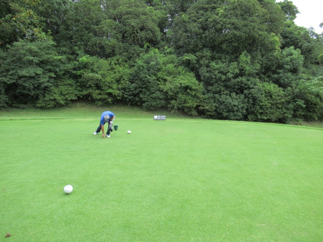 7番355yミドルは、ドライバーはナイス。PWで8mに2オン。無難にパー。素晴らしいバンカーショットでM.Tさんもパー。