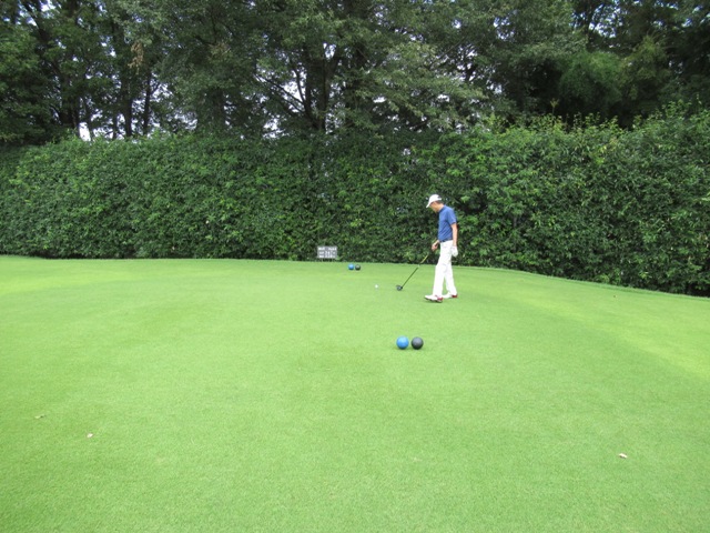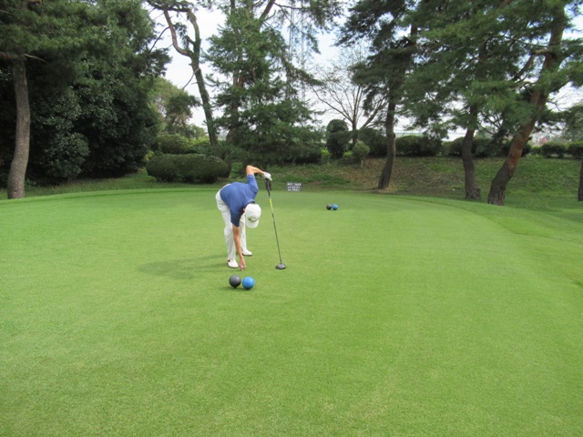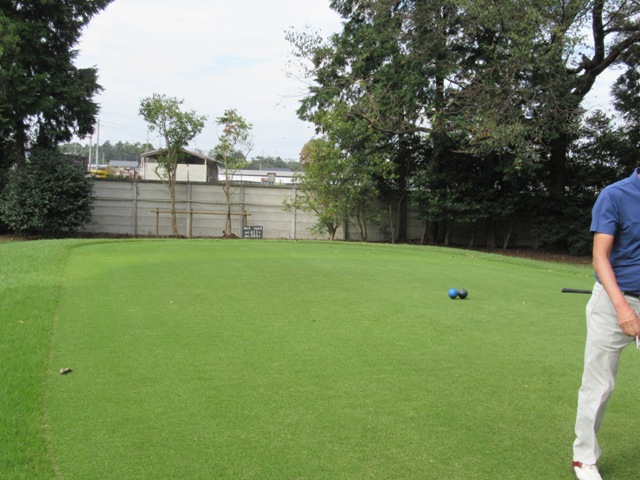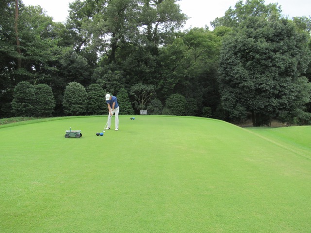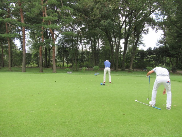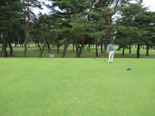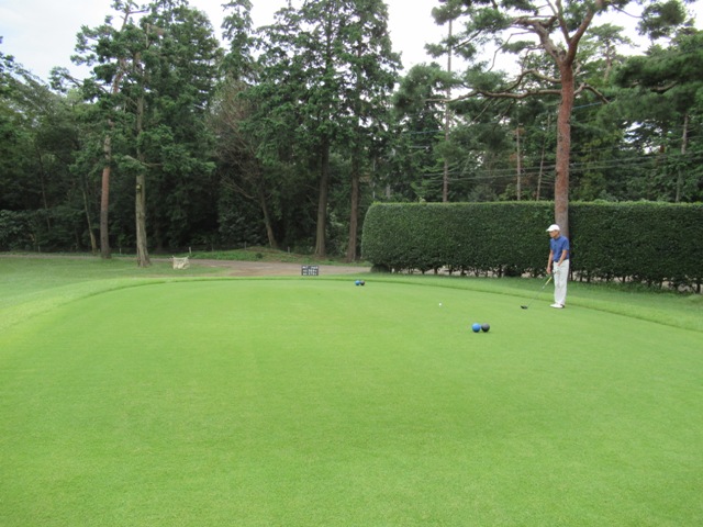 時間になり、下へ降りて行き、パターを転がします。今日は3サムで廻ります。前の組も3サムです。前の組はその前の組と随分と間隔が開いています。良さげかな??と思いきや、なんかイヤーな予感が。今日は黒ティで進行します。