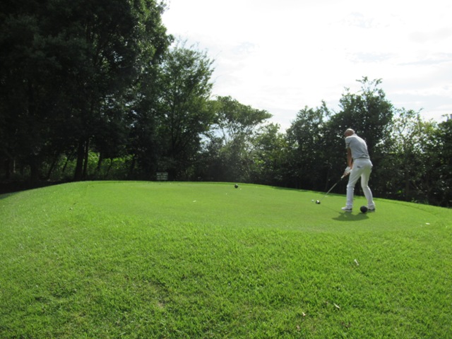 1番550yロングは、アゲンスト強いのでドライバーをドローで打つ。ナイス。3uでもドローでナイス。が、残りは155y。6アイアンで打つも右へ飛んでバンカーイン。ホームラン。寄らず入らずまたまたダボ。