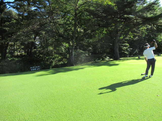 10番518yロングは、ドライバーはナイス。肩甲骨から始動せよ!実践してみました。3wも完璧。残り50yから56度で奥6mに3オン。無難にパー。同じく3オンのK.Kさんも無難にパー。