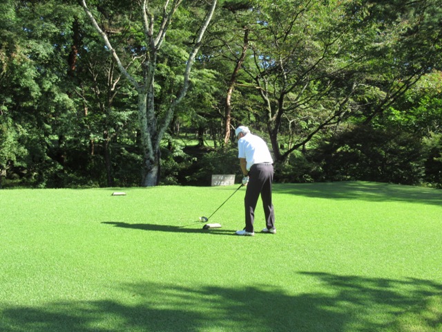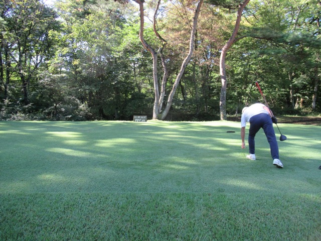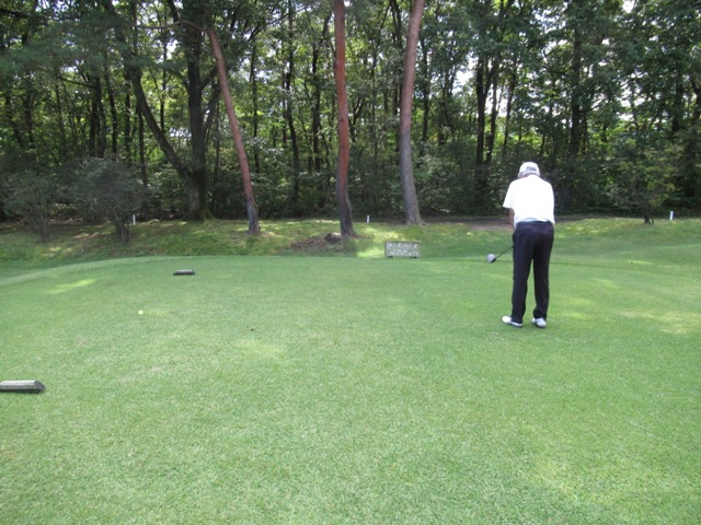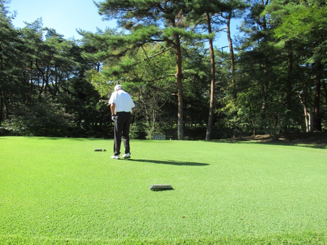 2番425yミドルは、ドライバーはまずまず。これまた4アイアンでバンカーとバンカーの間の良い位置へ。1.7mに3オンしたが、パターがショボ。ボギー。見事なアプ&パターでH.Tさんがパーでベスト獲得。