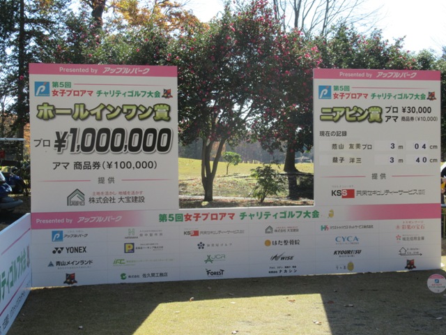 8番中継ニアピンホール149yシュートは、8アイアンで打つも右に外す。簡単なアプをミス。パターも入らずボギー。テレビカメラが回る中H.Kさんが3mにズドンと1オン。これまでのニアピンを獲得。素晴らしい。が、惜しくも残念パー。1アップ。
