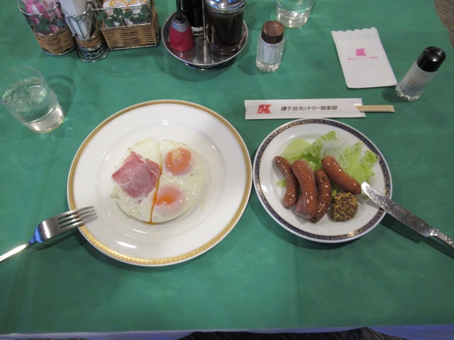 まずは、レストランでハムエッグとウインナー炒めを食します。ハムエッグはショボいです。