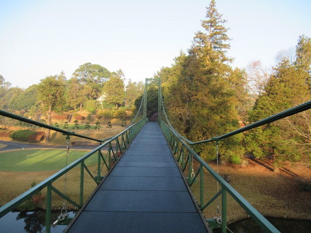 レストランでまずはベーコンエッグを食し、それからつり橋を渡ってアウトへ。昨日も侍時のキャディKさんでしたが、今日も侍時のキャディWさんです。連日の侍尽くしでございます。