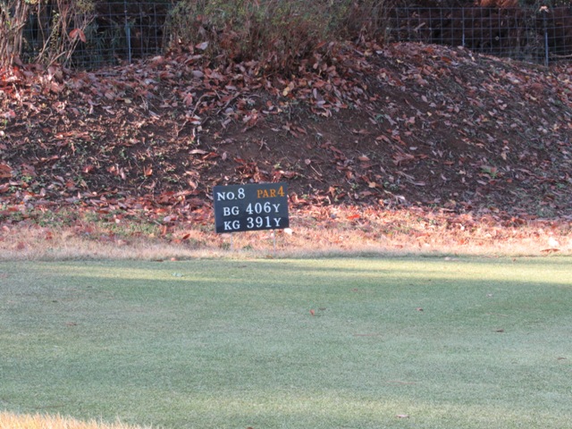 7番439yミドルは、ドライバーは大アゲンストで全然飛ばず。左ラフの穴からの3uはチョロ。残り130y上りを7アイアンでカラーへ。パターで打つも入らず。この大アゲンストの中、素晴らしいアプローチでJ.Mさんがパー。この風の中、70台に向かってバク進中。