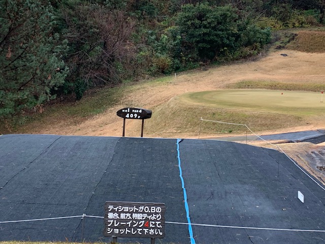 1番409yミドルは、ドライバーはスライス風に乗ってフェアウェイへ。7アイアンで打つもショボい球。も、アプがナイスでパー発進。