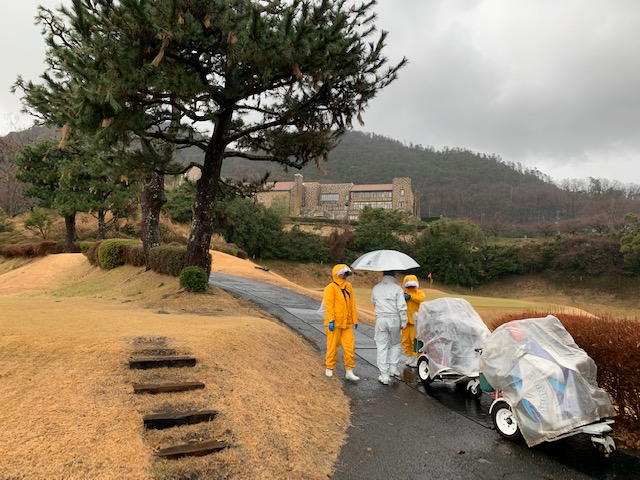 その後、濡れたクラブ等があるので、私はキャディバッグを担いでフロントへ。で、チェックインし、ルームへ。まずは、合羽を部屋のハンガーにかけて、その後は靴とクラブを出して、ルーム内で乾かす。