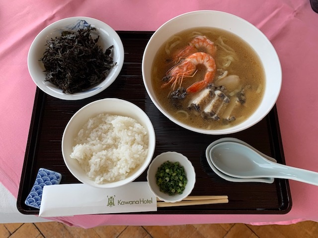 今は食事を摂る人達はバスでホテルのレストランへ向かうことになった模様。で、レストランへ。一番安いメニューが3000円超ですから、私のような人種は大変なんですが、アワビラーメンを食することに。うん、アワビは美味しいが、スープの味はコンソメ味らしいが、ラーメンにコンソメは合わないんじゃないかしら。私には不評。