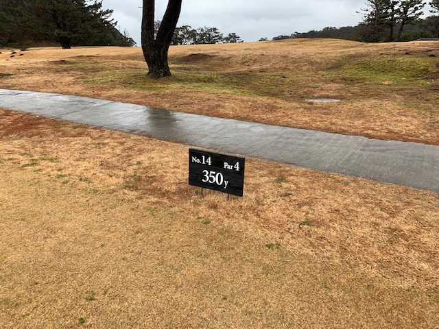 14番366y右ドッグのミドルは、ドライバーはまずまず。8アイアンでのセカンドはちょいと左へ。アリソンバンカーイン。寄らず3パンチでダボとなる。