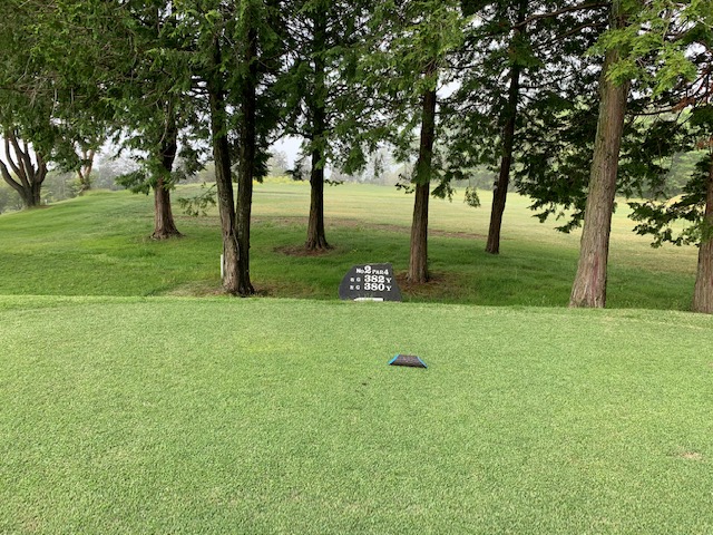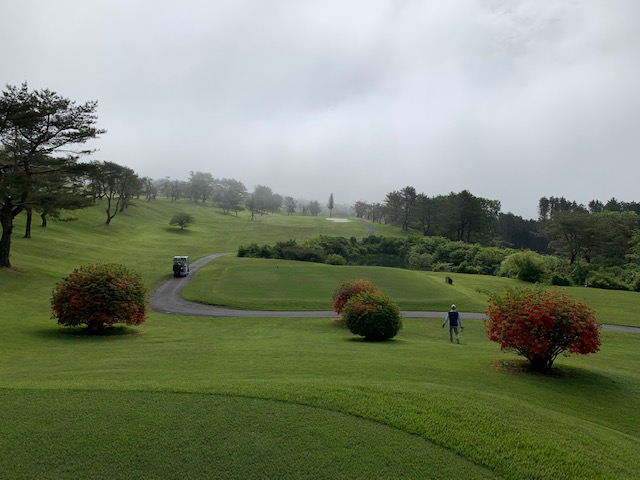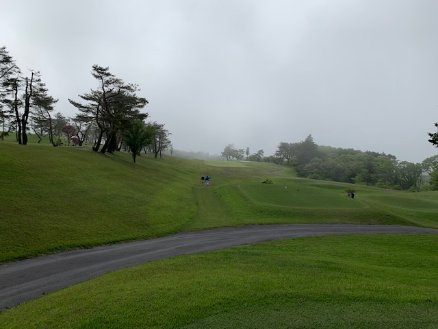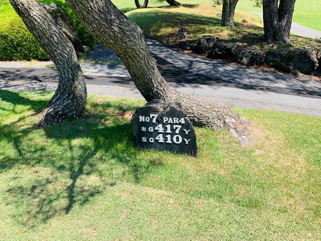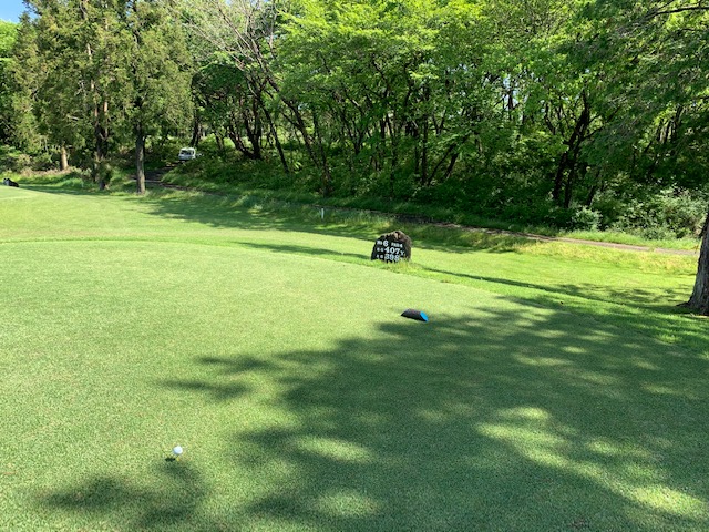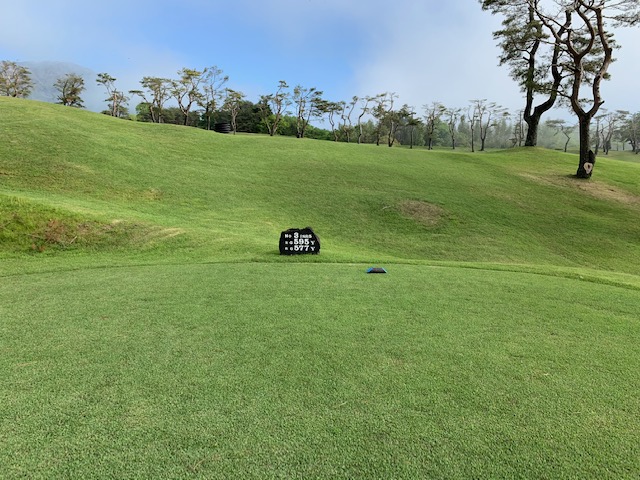 9番406yミドルは、ドライバーは右ラフへ。残り150y打ち上げ木越えを8アイアンで打つも木に当たる。残り65yをなんとか3mに3オン。が、入らず万事休す。