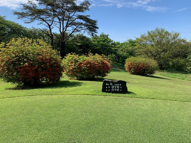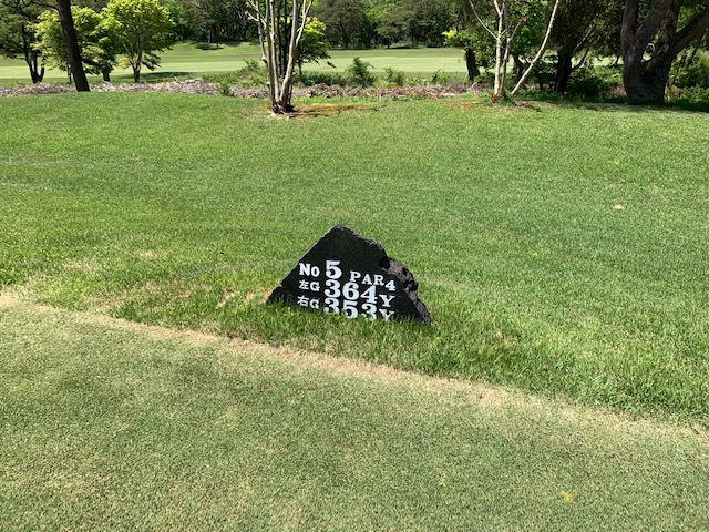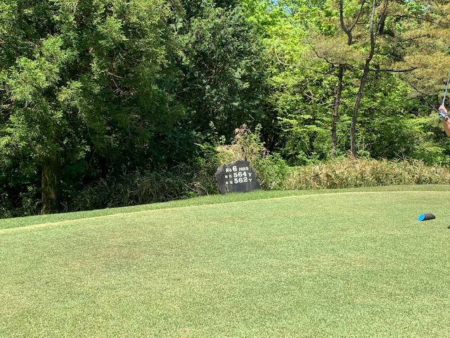 5番376yミドルは、ドライバーはナイス。が、大きな穴にイン。ガクッ。7アイアンでトップに打つつもりがどダフリ。センターの林の中へ。52度で打つも木に当たる。なんとか1mに4オン。沈めてナイスボギー。