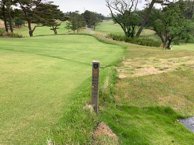 7番473yと長い右ドッグのミドルは、ドライバーは右のバンカーイン。5アイアンで打つもダフッて飛ばず。52度で4mに3オン。ボギー。見事なドライバーと3wでM.Cさんが3mに2オン。残念パー。