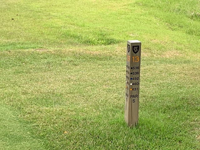 13番536yロングは、ドライバーはまずまず。5アイアンで残り110yへ。PWで4mに3オン。残念パー。しかし、昔11を打ったこのホールをパーと踏破しておいた(笑)。ここ、右のバンカーに入れたら大変なんですわ!