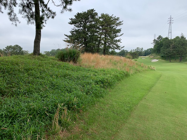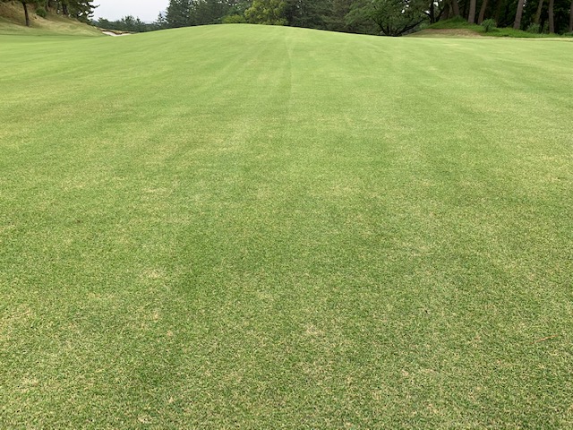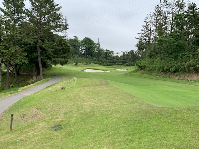 5番523y右ドッグのロングは、ドライバーは右へ飛ぶ。OBっぽい。暫定球は3wで左ラフへ。探したがない。4打目を3wで残り140y上りへ。8アイアンで5オン。ダボ。しっかり3オンのS.MさんとM.Cさんが無難にパー。