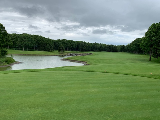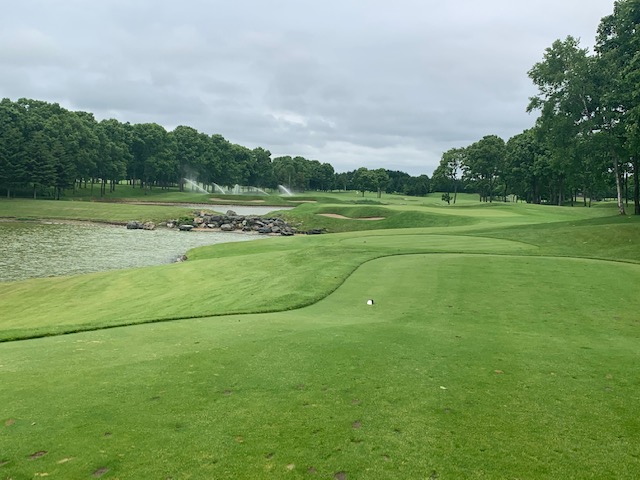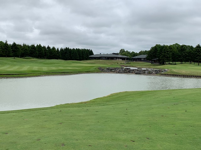 18番432yミドルは、ドライバーは左ラフへ。4アイアンでグリーン左手前を狙う。なんとか池を避けてまずまずの位置へ。3打目は寄らず。入らずボギー。