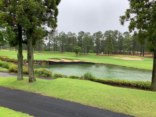 12番514yロングは、ドライバーはまずまず。が、セカンドの3wがチョロ。3打目も3wで残り140y。8アイアンで打つも竜巻球でお池にジャブン。ドロップしての6打目がナイスでなんとか7で上がる。ここはティイングエリア先130yまでにも池がある。この悪天候で手が滑りなかなかしんどいラウンドになっていたりであるが、プレーヤー及びキャディのHさん、Iさんともに皆様まだまだ精気がみなぎっている。頑張ろう。